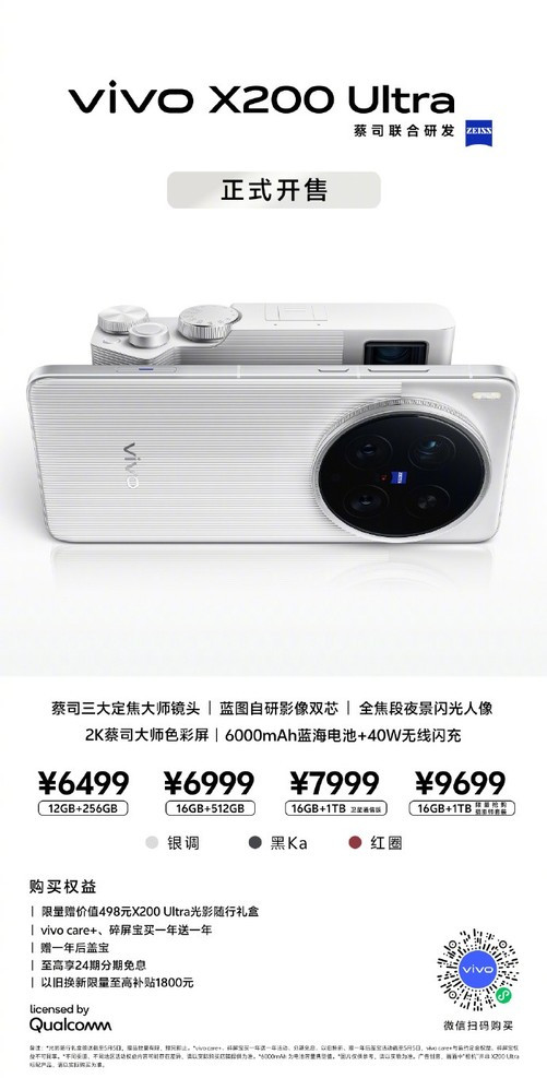 除影像外,vivoX200Ultra配置同样豪华。骁龙8至尊版移动平台提供强劲性能支撑;6000mAh蓝海电池搭配90W有线+40W无线闪充,续航无忧;2K蔡司大师色彩屏结合圆偏振光护眼技术,显示与护眼兼具。售价区间为6499元-9699元,购买可享限量赠送498元光影随行礼盒、vivocare+及碎屏宝买一送一、赠送后盖宝、至高24期分期免息、以旧换新限量至高补贴1800元等丰厚权益。